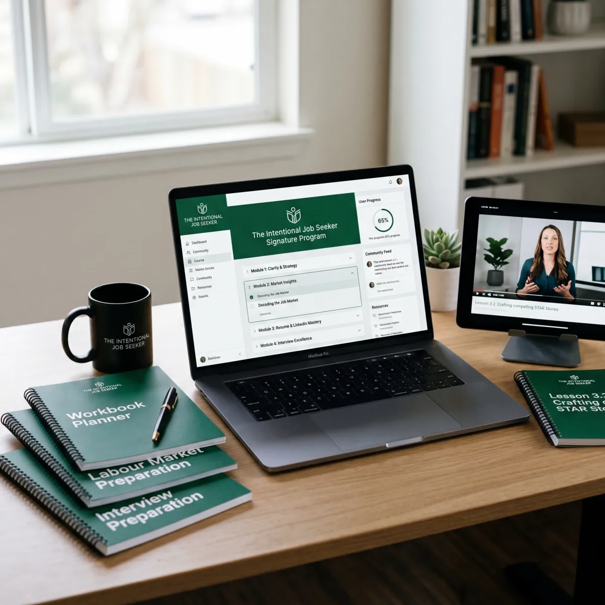 Includes lifetime access to the 7-module core program, 65+ expert-led videos, and three downloadable workbooks (Workbook/Planner, Labour Market Preparation, Interview Preparation). Our signature program also includes one year of access to The Intentional Job Seeker Membership for continued support, accountability, and skill development.